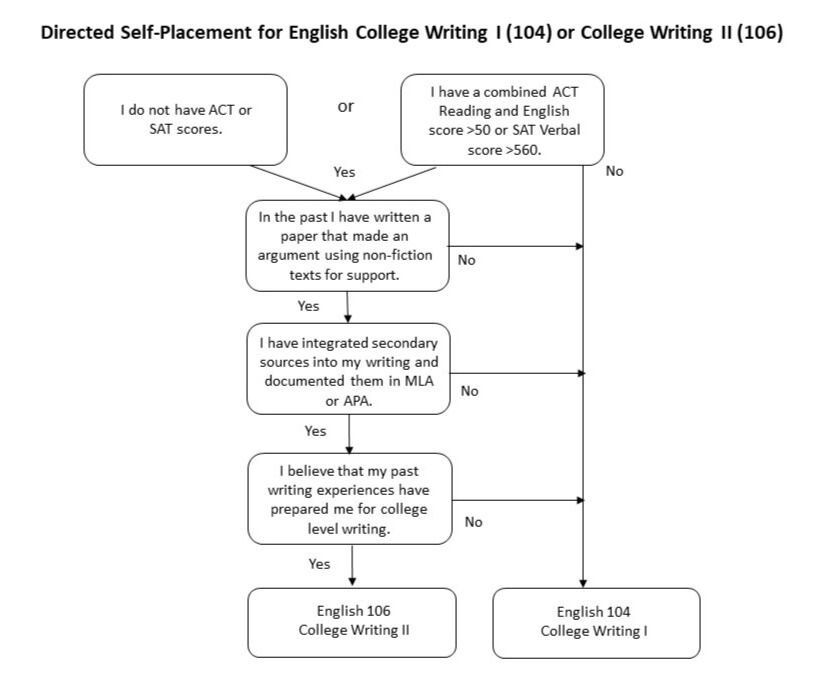 - If you do not have transfer credit for English first-year writing courses, please see the flowchart, which notes some skills that will be addressed in first-year composition classes, and consider how well your high school writing classes have prepared you for these skills. Many students who have As in their high school English classes find that they are prepared to take English 106, while students with Cs are best placed in English 104. Students with Bs may fit into either class, depending upon the skills that they developed in their high school English career.