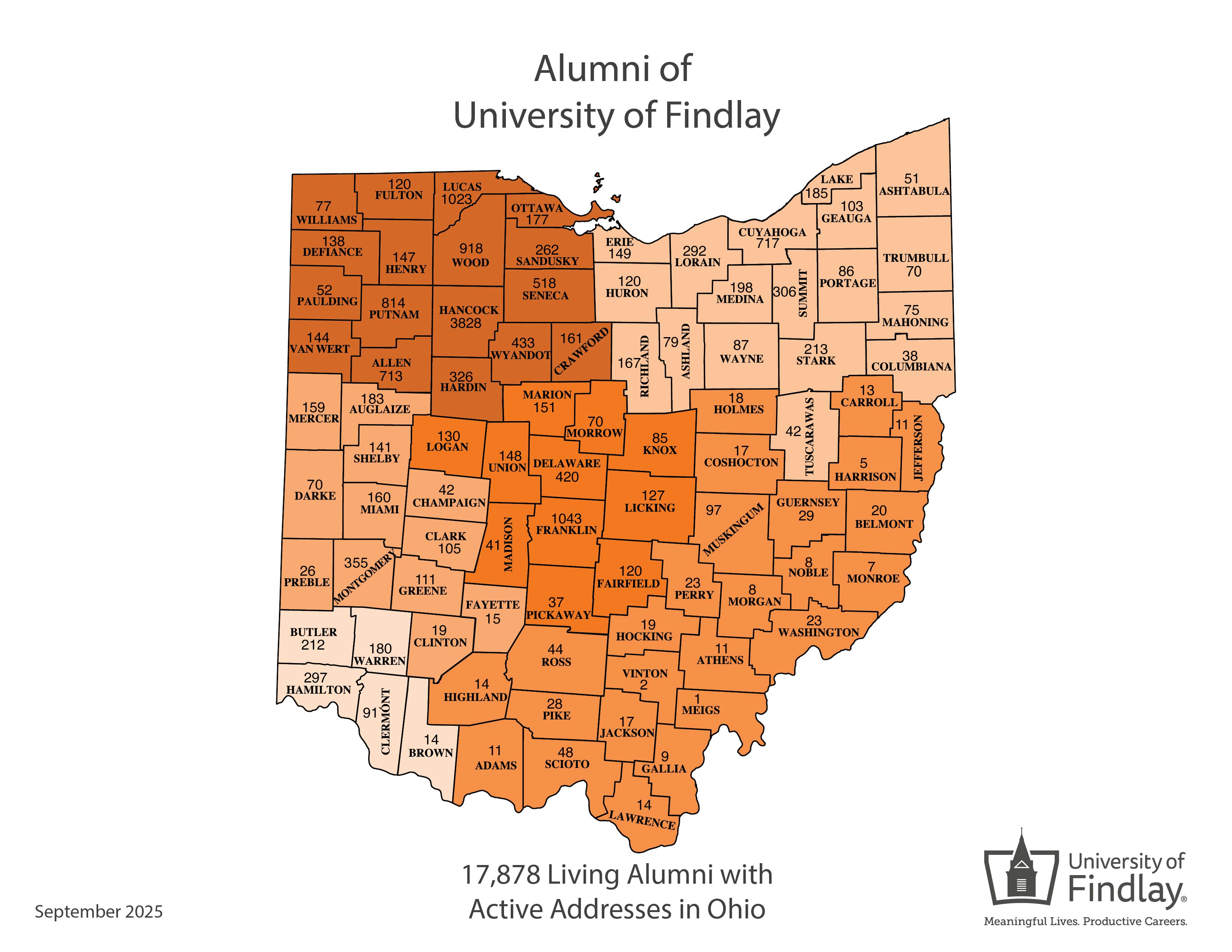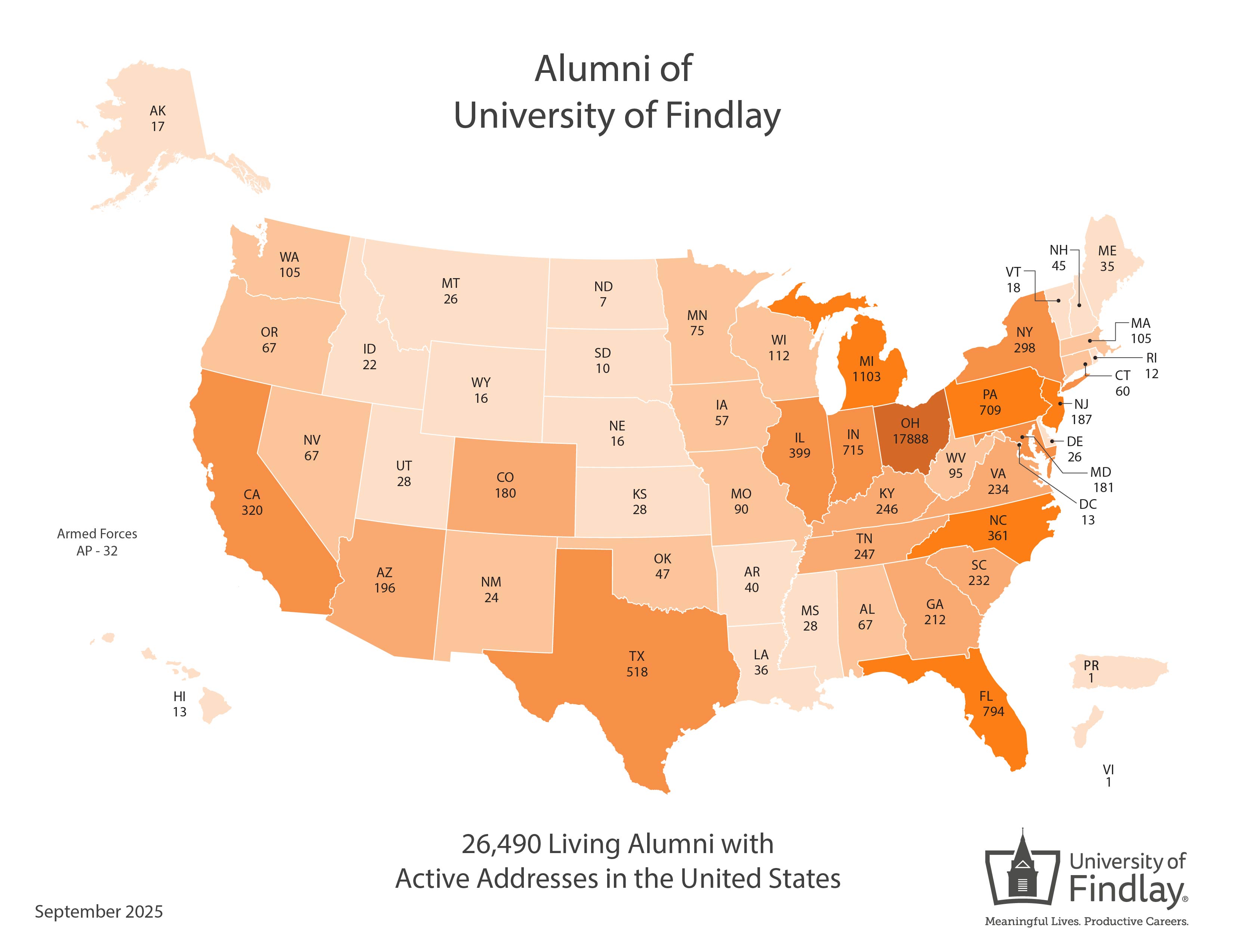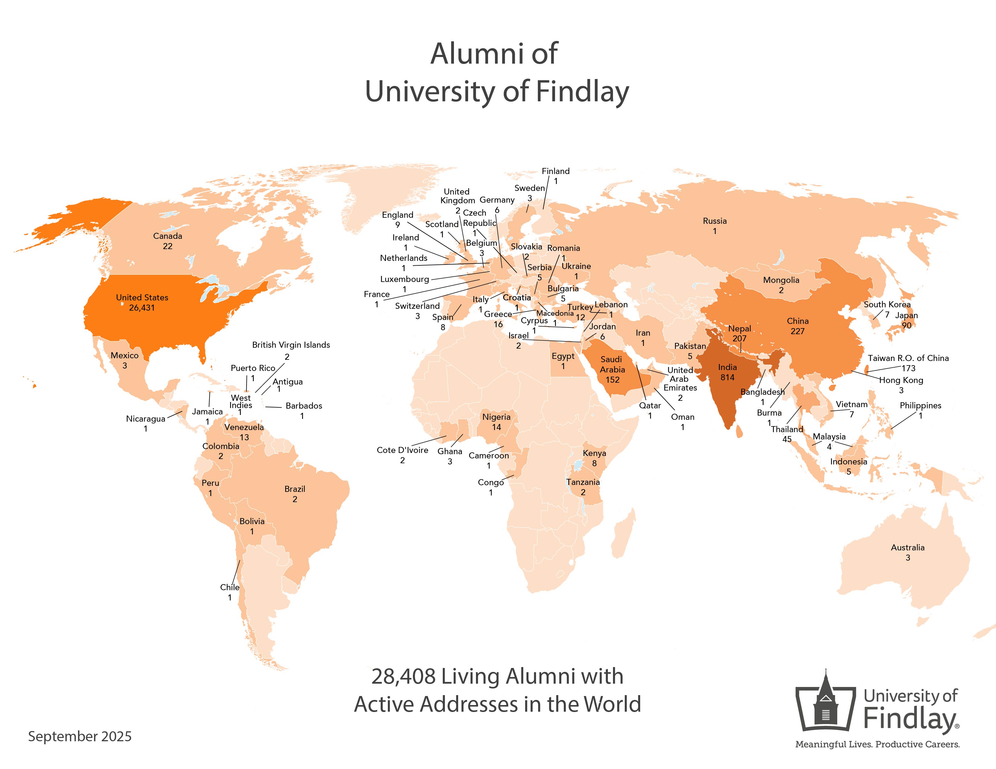 When students walk back through the Griffith Memorial Arch at commencement, they take the next step toward opportunities across the country and around the world. University of Findlay has over 26,000 alumni nationwide and more than 1,500 alumni living outside the United States. See how many live near you!